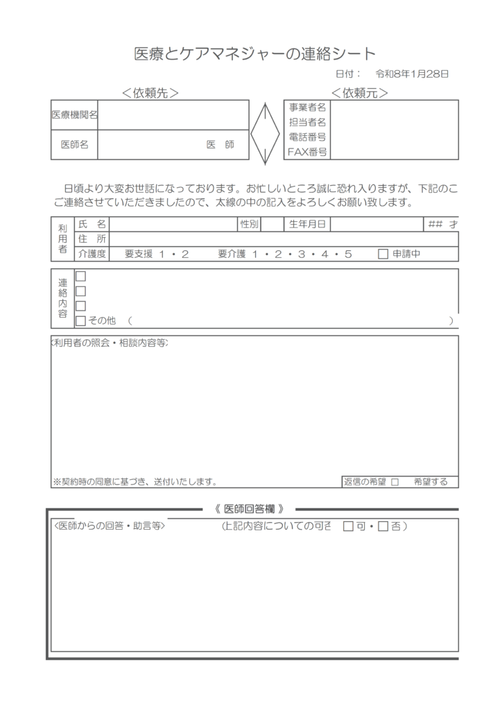 情報提供書は利用者の在宅での生活状況、入退院の際における状態変化、また、施設への入退院時の連絡調整と互いに情報提供を行うことで、利用者へのよりよい支援に繋がればと考え作成しました。平成30年4月には診療報酬及び介護報酬が改訂され医療機関では入院前の患者の生活状況(内服薬、介護保険サービスの利用状況、ADL、IADLなど)の状況把握が強く求められるとともに、居宅や施設担当者においても入院患者様の情報提供が求められています。また退院時においても居宅や施設担当者は入院中の経過や状況を確認し円滑に退院後の生活が送れるよう支援することが必要です。