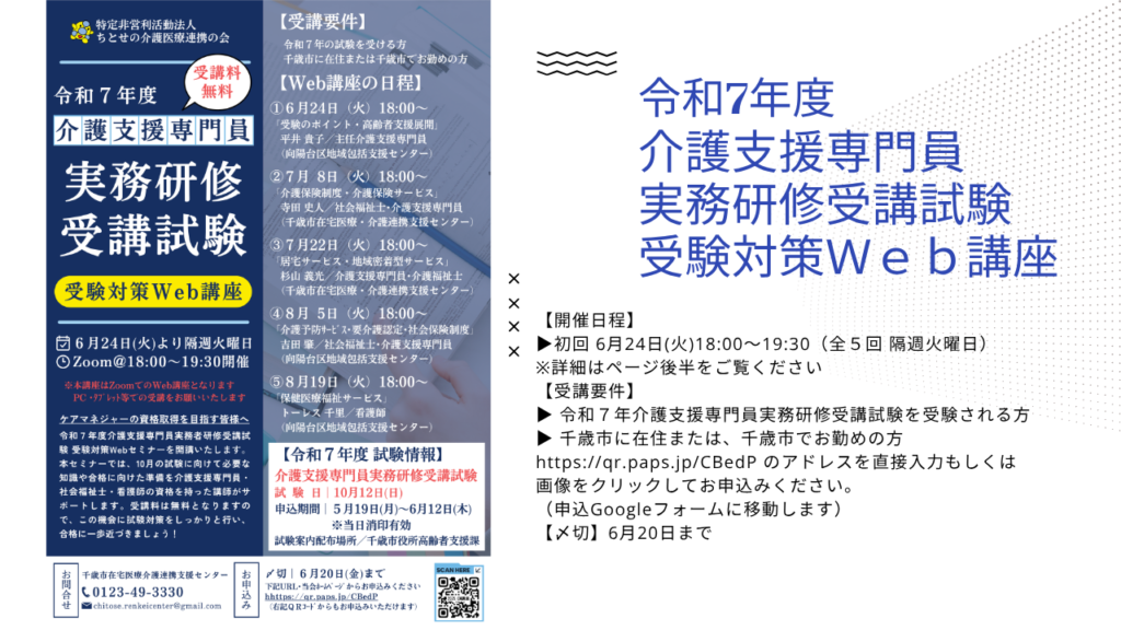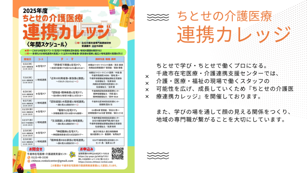 このページでは、介護・医療分野で働く皆さまのスキルアップや資格取得をサポートする各種研修・講座をご案内しています。多職種連携を学ぶ「連携カレッジ」、介護支援専門員実務研修受講試験対策講座、介護福祉士試験対策講座、そして介護従事者初任者研修など、現場で役立つ知識と実践力を身につけるためのプログラムを幅広くご用意しています。キャリアアップや自己成長を目指す方は、ぜひご活用ください。